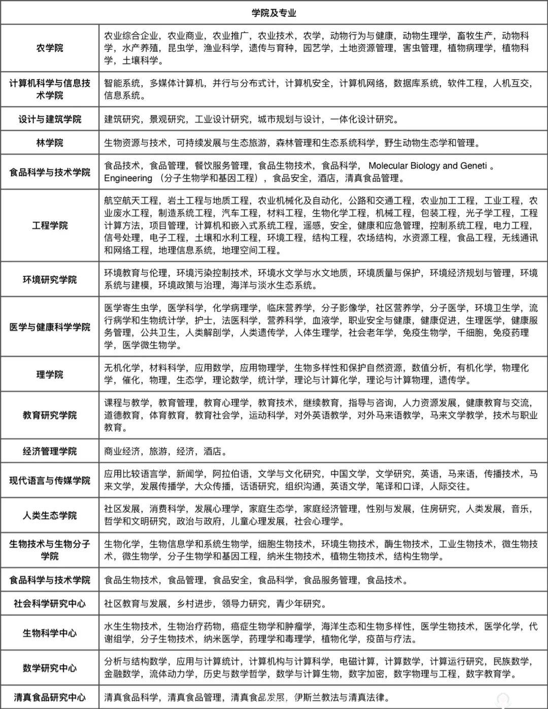 16个院系:农业学院、林业学院、兽医学院、经济与管理学院、工程学院、教育研究学院、理学院、食品科学与技术学院、人类生态学学院、现代语言与传播学院、设计和建筑学院、医学和卫生科学学院、计算机科学和信息技术学院、生物技术和生物分子科学学院、环境研究学院、农业和食品科学学院